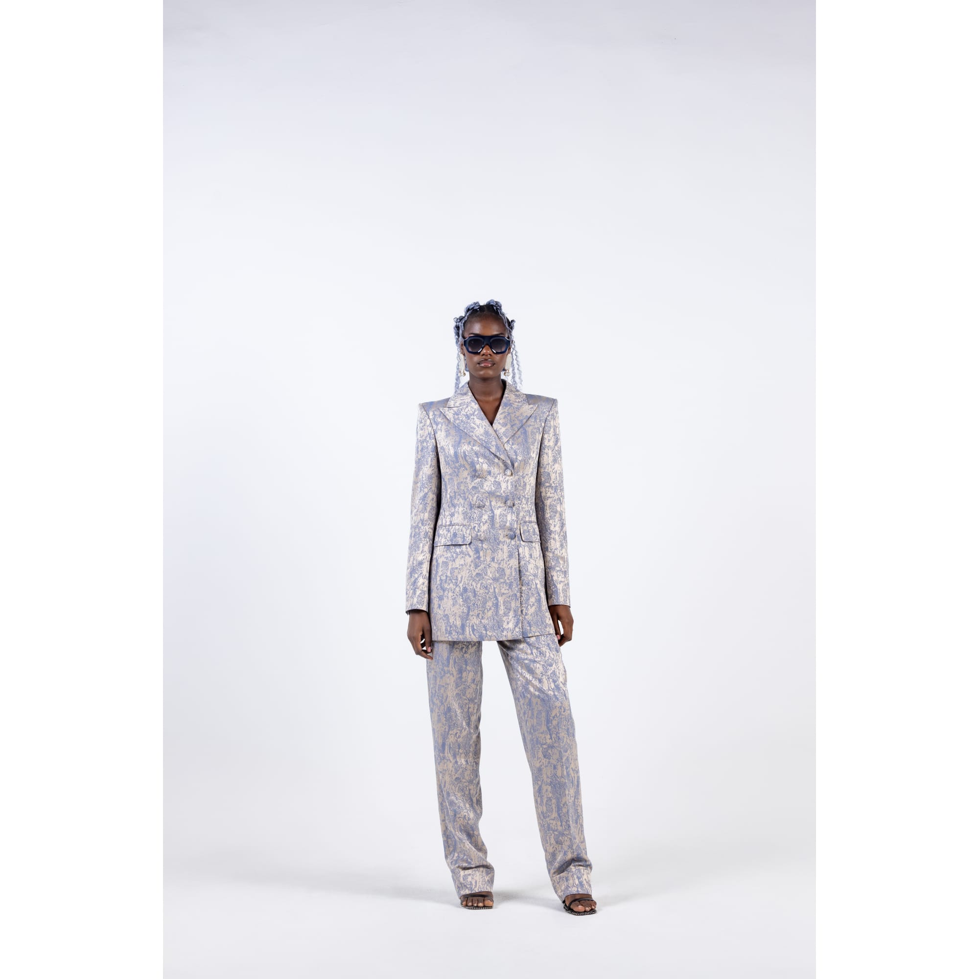 NAVY BLAZER AND GREY WIDE TROUSER