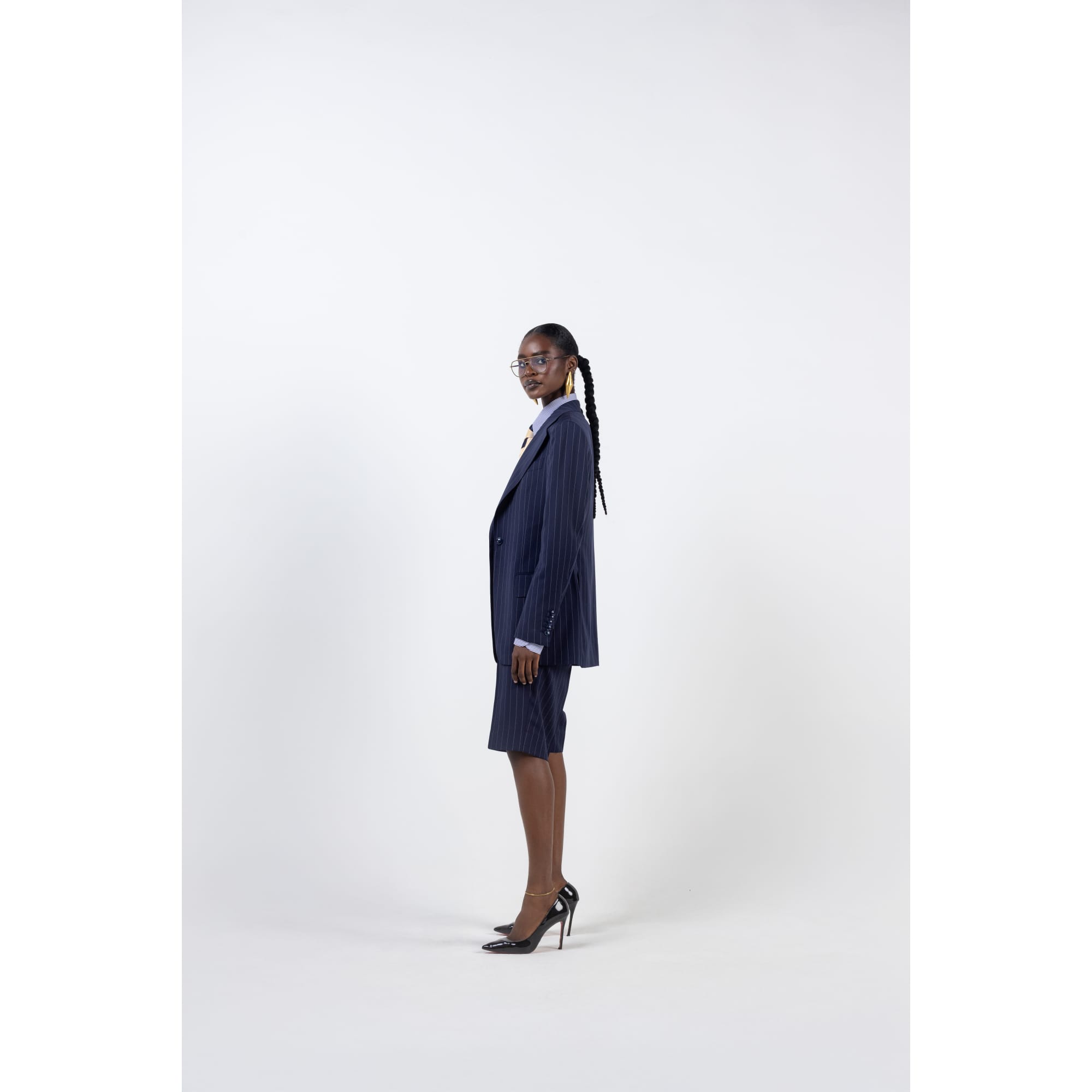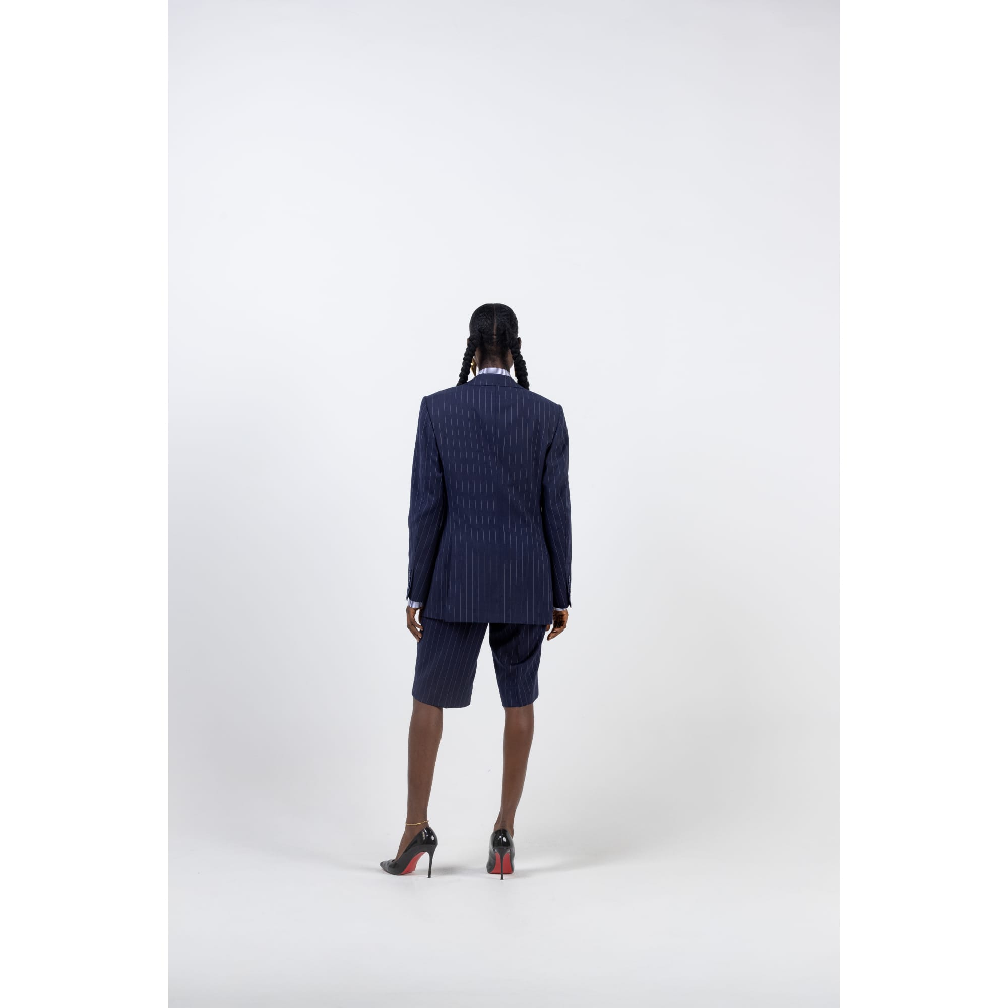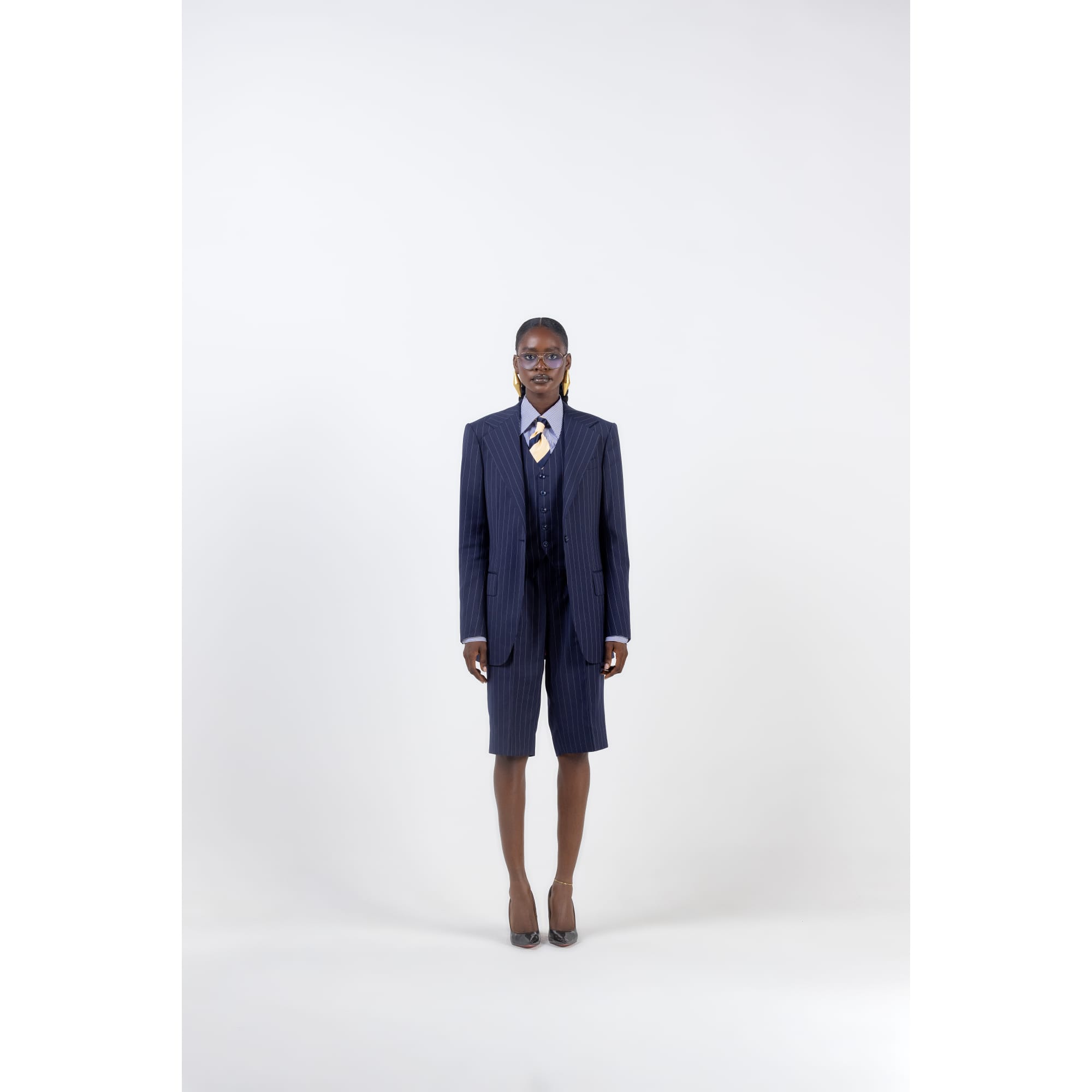 Blue pinstripe three piece suit features a bespoke jacket, waistcoat and tailored shorts